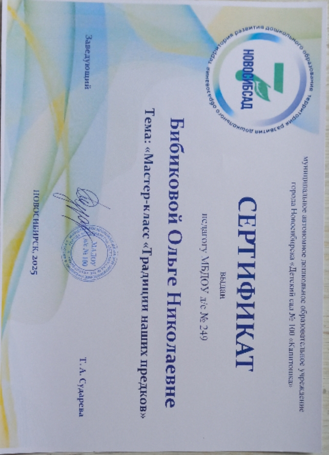 Сертификат участника мастер-класса "Традиции наших предков" в рамках проекта "Новосибсад"